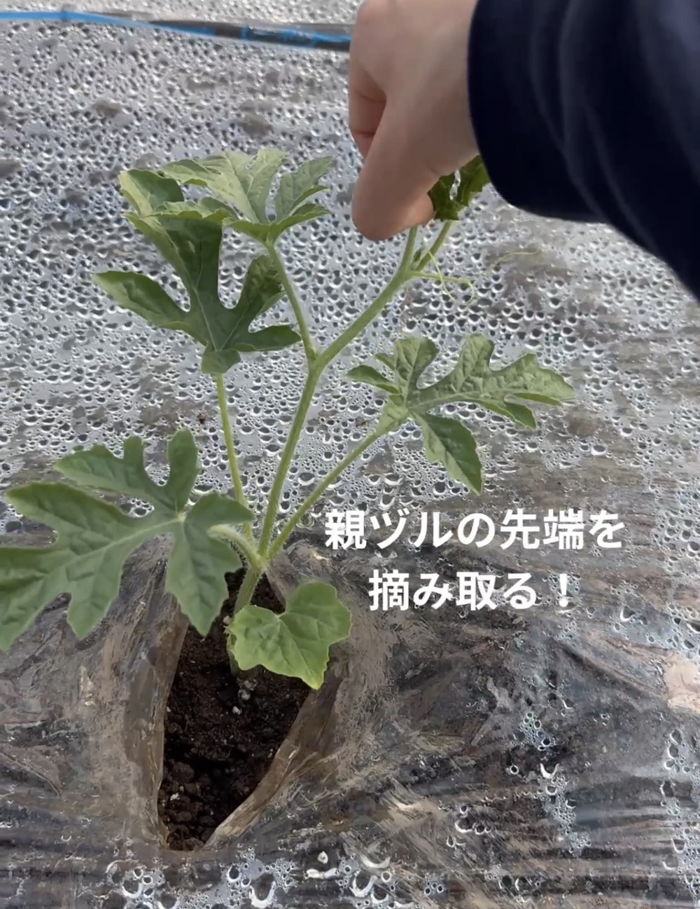 スイカ苗の先端(親ヅル)を摘み取る