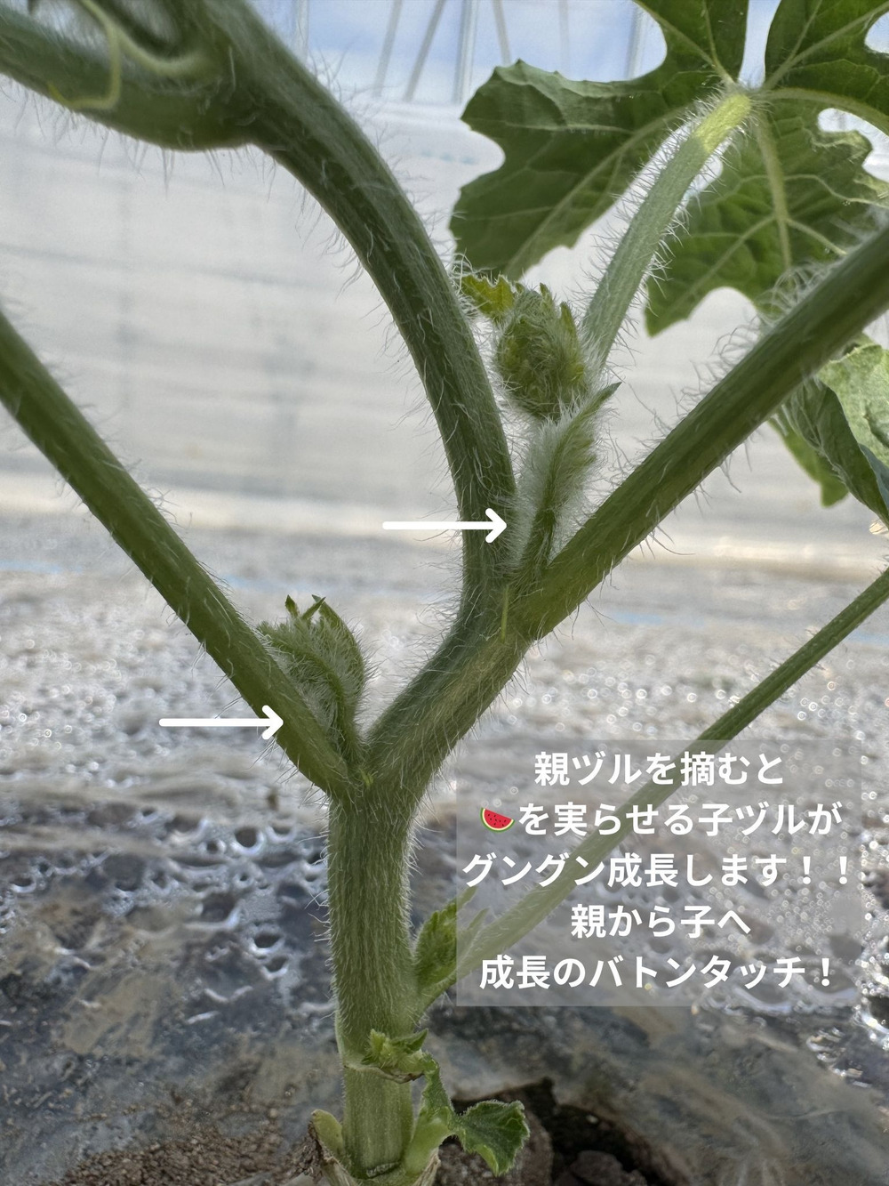 スイカは子ヅルに実らせるので、