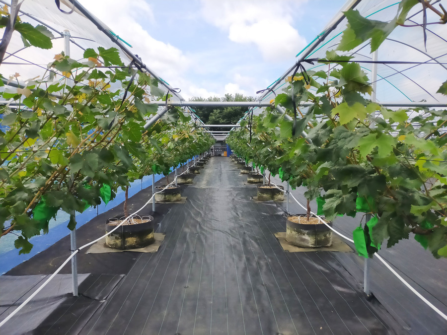 2023年にルートラップポット20鉢の初作付けを行い、2024年に60鉢を植付けY字ぶどう棚と自動灌水装置も完成して2年かけてやっとぶどう園の全体像が整ってきました。