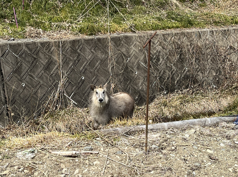 現在ビニールハウスの修復真っ最中ですが、何か視線を感じると思ったらまさかの「カモシカ」さんがジーーーッと見守っておりました!