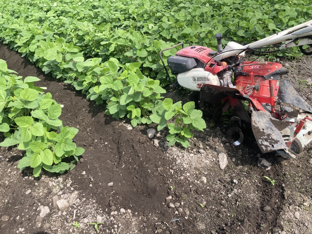 (写真2枚目)うねをあげると、(倒伏防止)丈が伸びます。と、同時に土をかけて除草もしてます。極力農薬を使わないように心がけていますが、草の勢いもすごい😅
