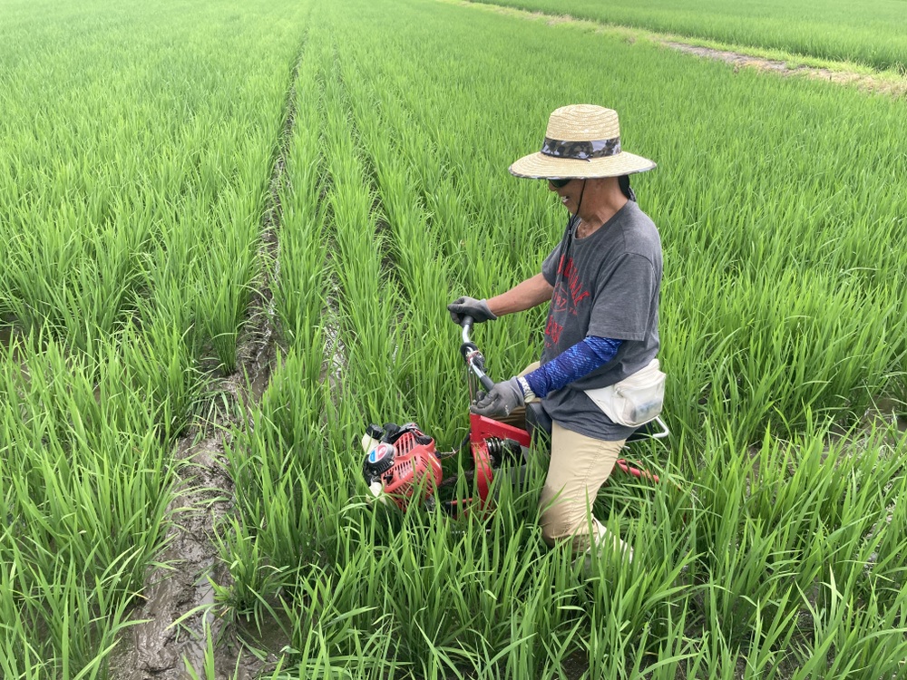 田んぼでは『溝切り』という作業をしてます。水の通水を良くするために行うもので、名前の通り田んぼ内に溝をつけます。水が瞬時にいきわたるように、雨が降った場合は、排水がスムーズに行われるような仕掛けです。
