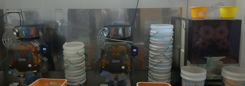 写真の右側から3sや2s、中央はsやM、左側はMやLを搾るジューサーです。