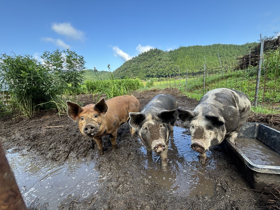 村の遊休農地を活用して放牧場をDIY。広い圃場でのびのびと豚さんたちが過ごしています。エサはパンくず・米麺くず・豆腐粉などの地域資源を活用した自家製の発酵エサ。貯蔵性・嗜好性の良いエサをモリモリ食べて、いっぱい走り回って、通常よりもゆったりとしたペースで大きくなります。