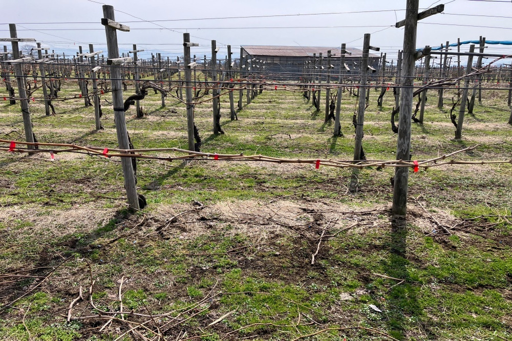 今は、ぶどうの枝を一本ずつ金属線に固定していく「結束(けっそく)」という大切な作業の真っ最中です。