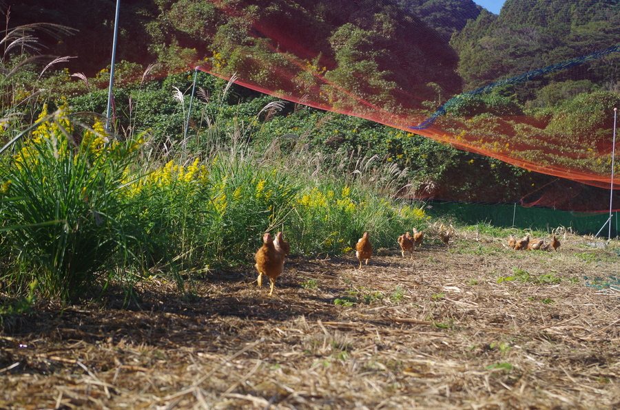 薮化した耕作放棄地を活用し、ニワトリたちは放し飼いでストレスなくのびのびと暮らしています。