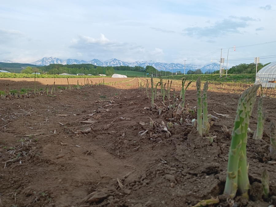 北海道・美瑛町の雄大な大地で育った、採れたてアスパラガス!昼夜の寒暖差が大きい美瑛町で育ったアスパラガスは、甘みが強く、みずみずしいのが特徴です。太陽の光をたっぷり浴びて育ったアスパラガスを、ぜひご賞味ください!