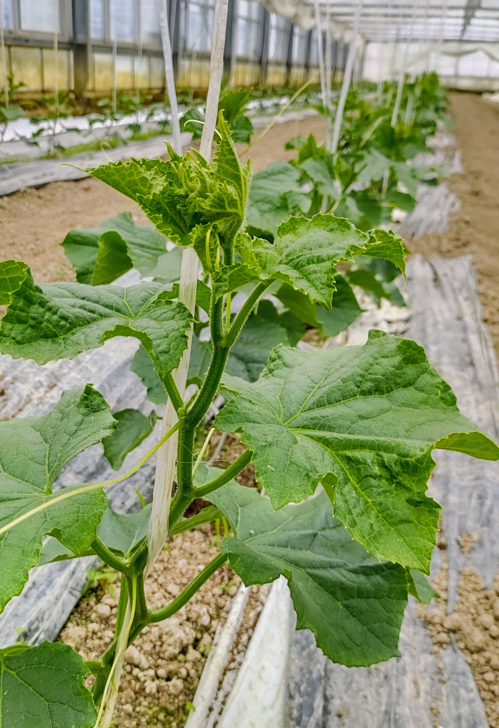 最近のスーパーではツルッとしたキュウリが主流ですが、当園の四川キュウリは、トゲがしっかりあって少しシワも寄っている、昔ながらの無骨な姿をしています。