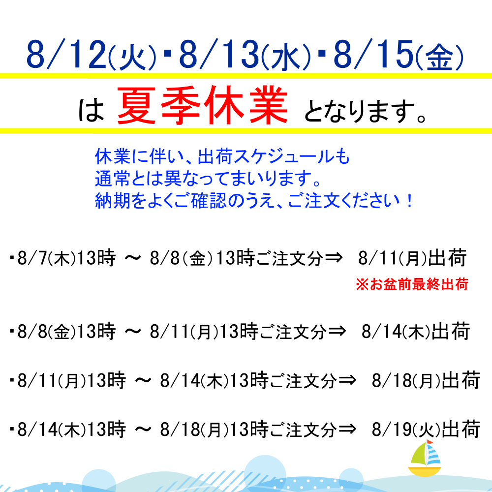 8/12(火)・8/13(水)・8/15(金)は夏季休業日となります。