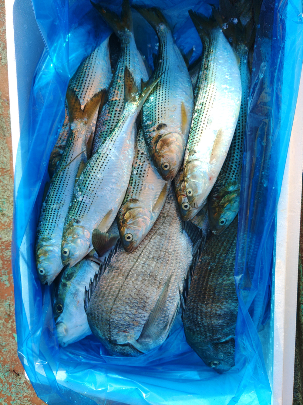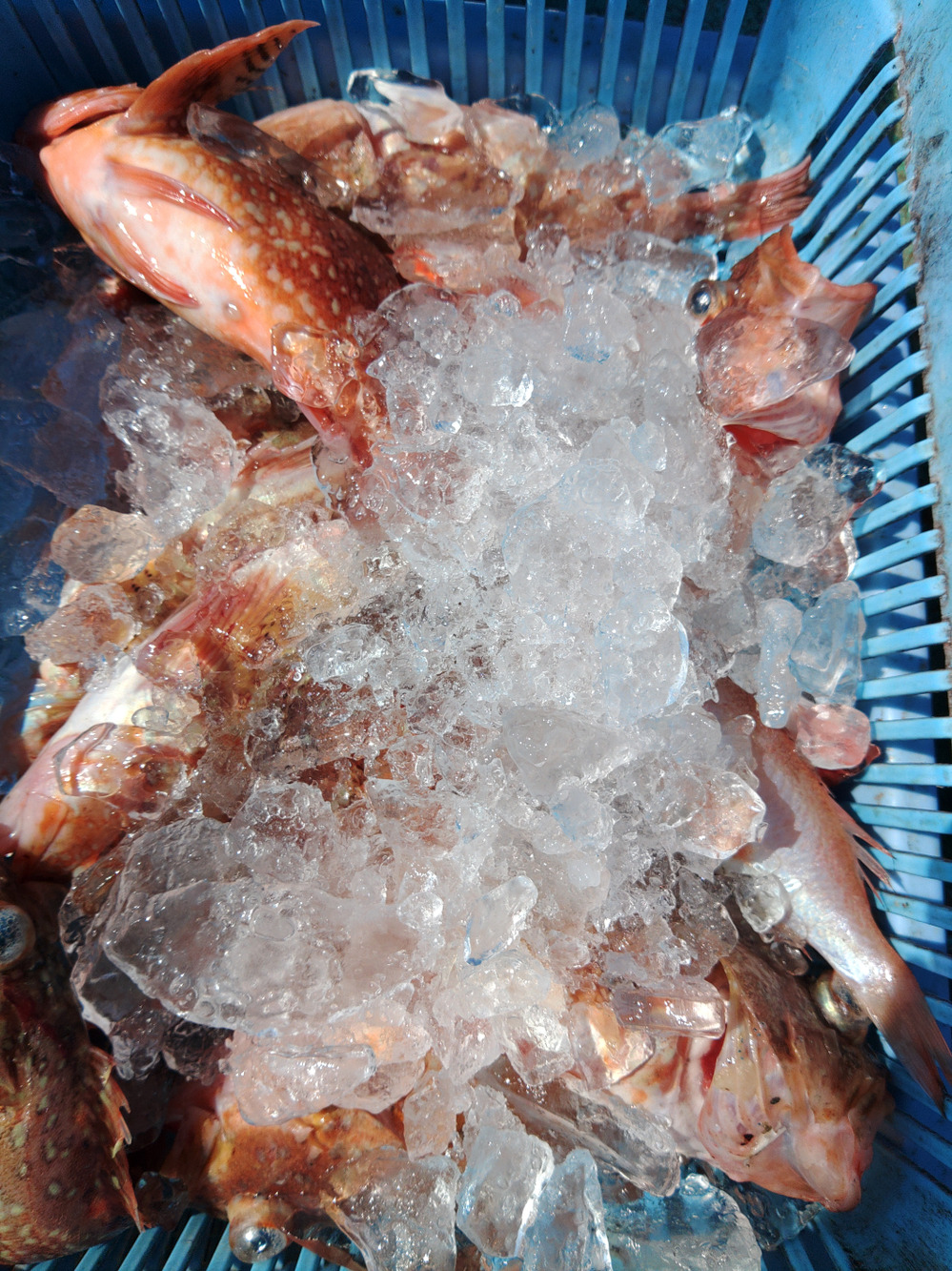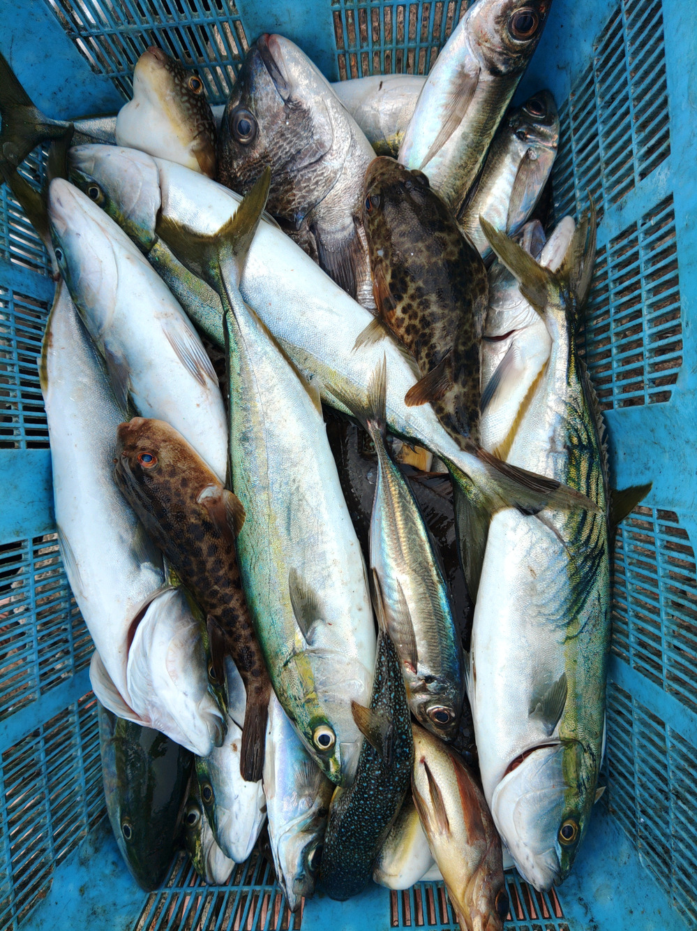春はいろんな魚がとれます。 一年のうちで一番魚種が多く、定置網も色とりどりになります。