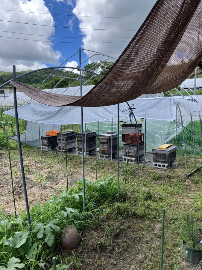 そして2024年春より、夢だった養蜂を畑の一画で始めました。自然栽培の畑はミツバチさんとの相性もよく、畑内のズッキーニの花や庭先の小さなラベンダー。土手に咲く小さな草花などあちこちに遊びにきています。飛行先を観察するとご近所さんのお庭にも飛来しているようです。