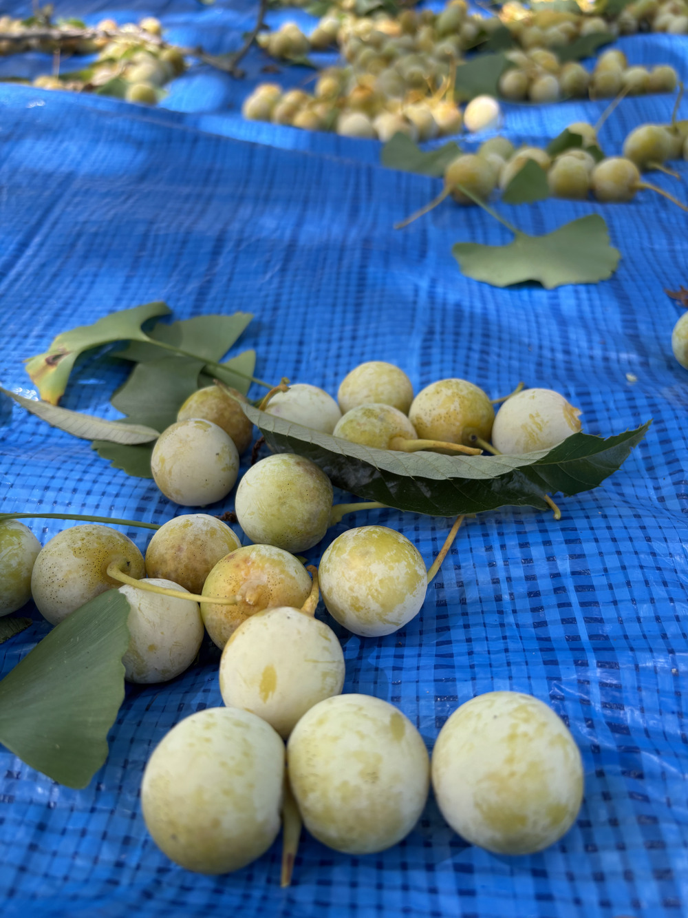 銀杏の収穫作業が始まりました。今年の銀杏は、成長時期に雨が少なかったせいなのか、小さい粒が目立ちます。頑張って収穫します。
