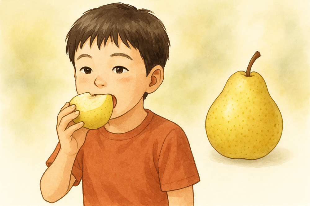男の子のイラストの梨はなんと、洋梨