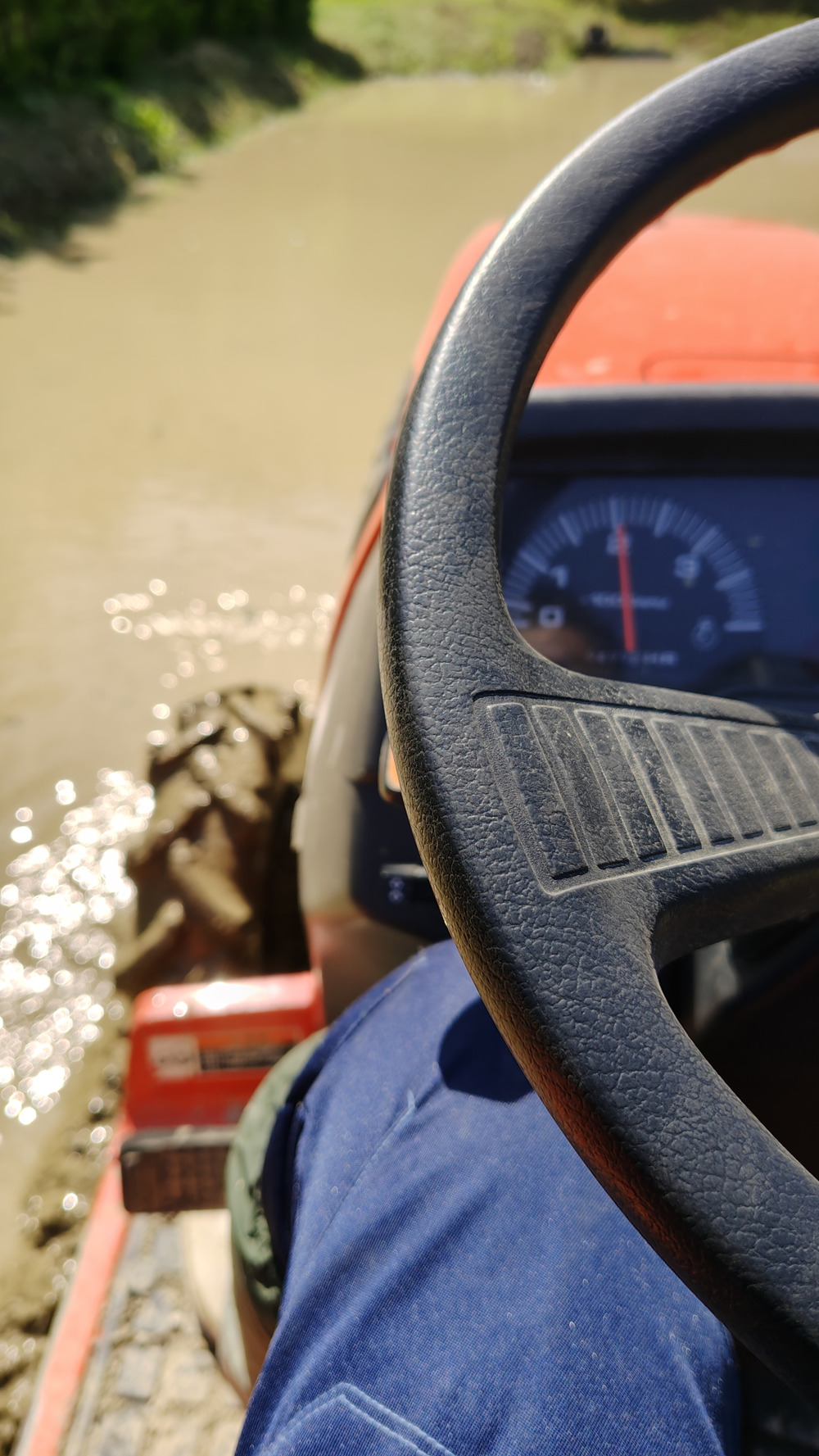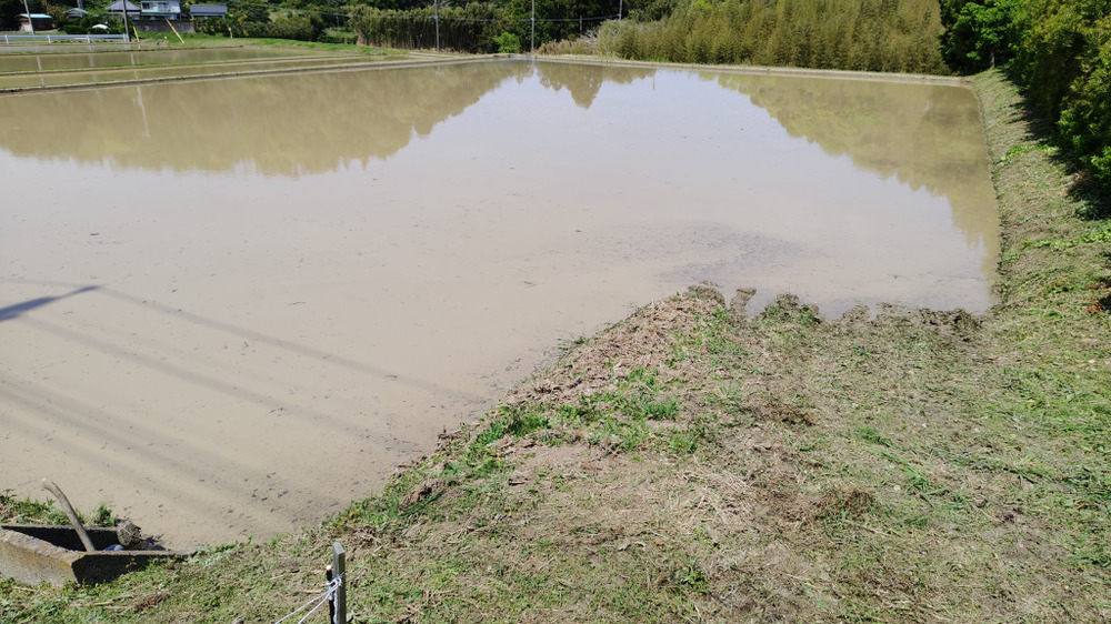 田んぼの土を水と一緒に混ぜて砕いて、土を均等にする作業を代かきを行いました。