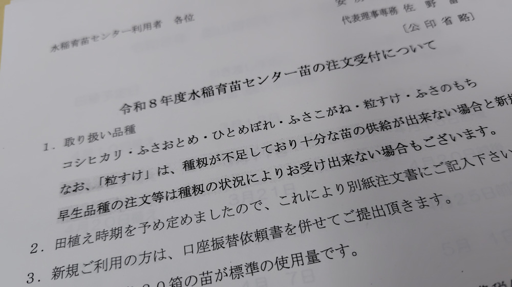 そして、来年度も引き続き「粒すけ」を作付するため必要枚数の注文をしてきました。