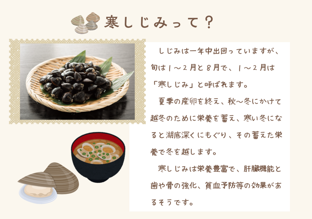 寒しじみは栄養豊富で、肝臓機能と歯や骨の強化、貧血予防等の効果があるそうです。