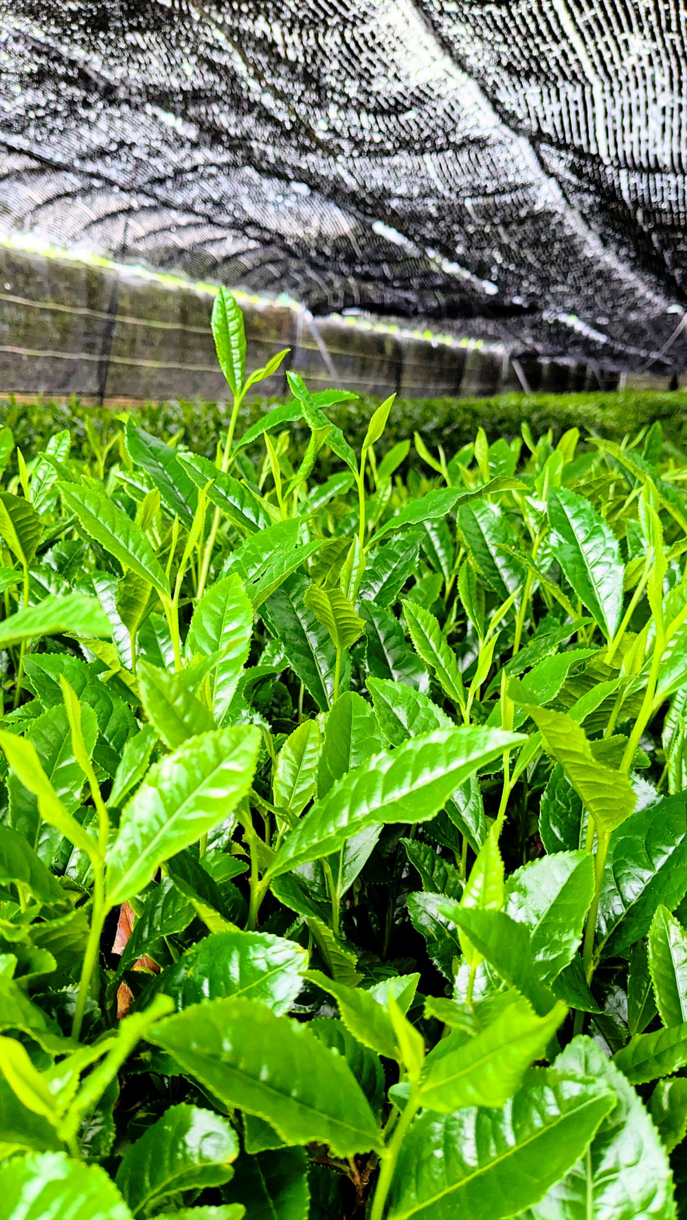 春、碾茶専用の畑を丸ごと黒い幕で覆い