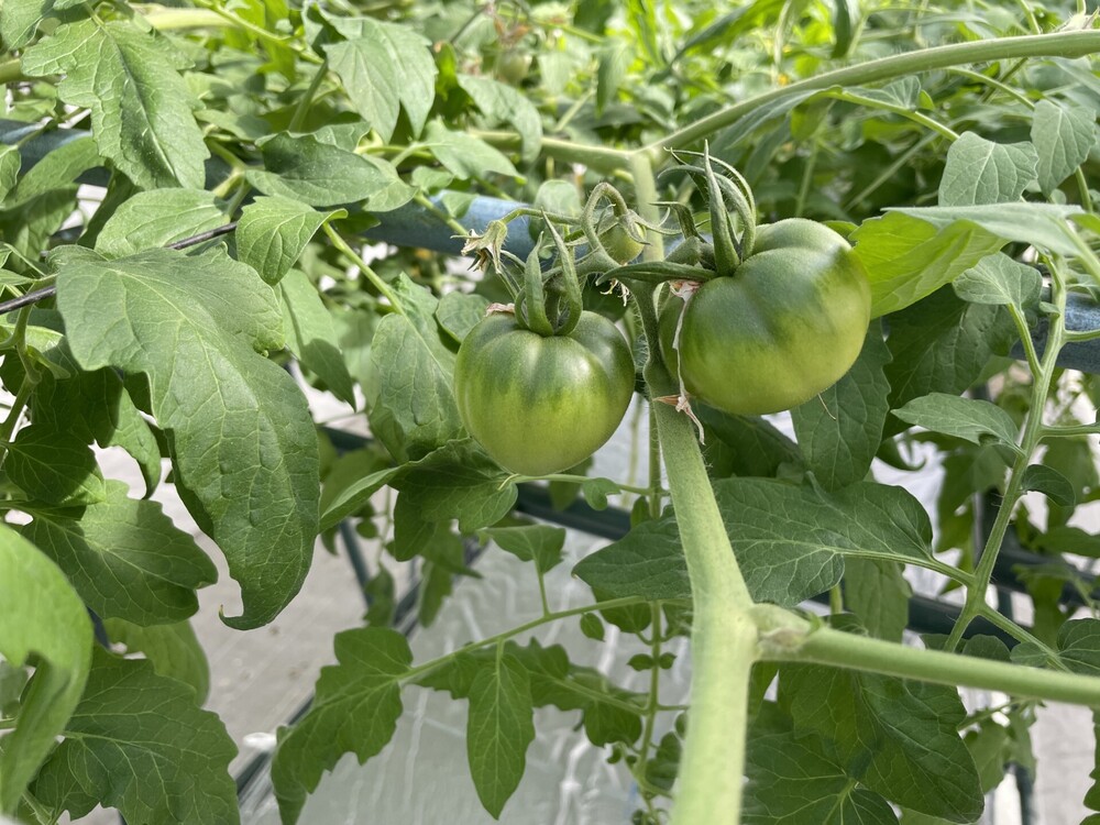 トマトの実も太陽の恵みをいっぱい浴び、ヘタ周りにしっかりとベースグリーンが見えてきました。