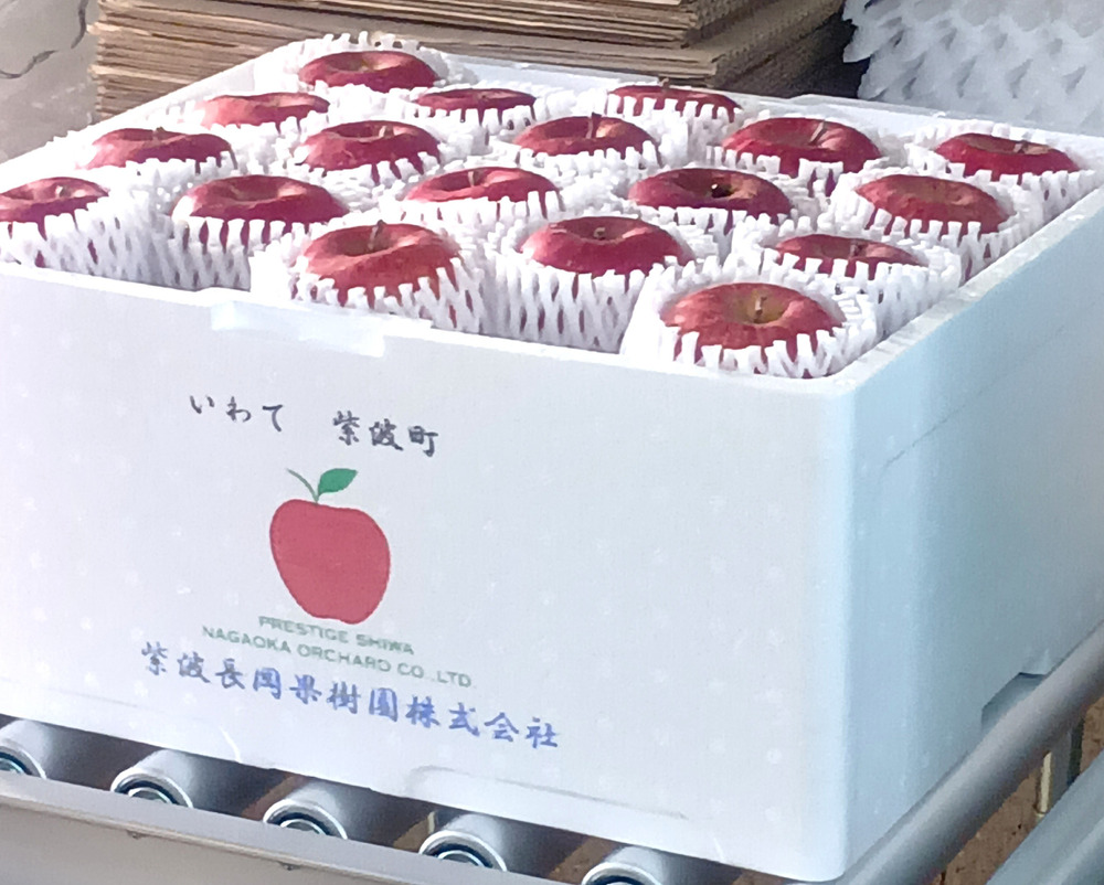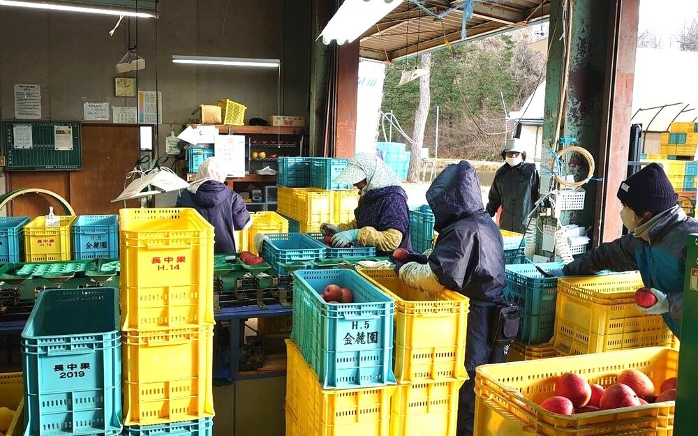 雪の中のサンふじの収穫が終わり、選果をかけたものを台湾への輸出用に箱詰めしています。