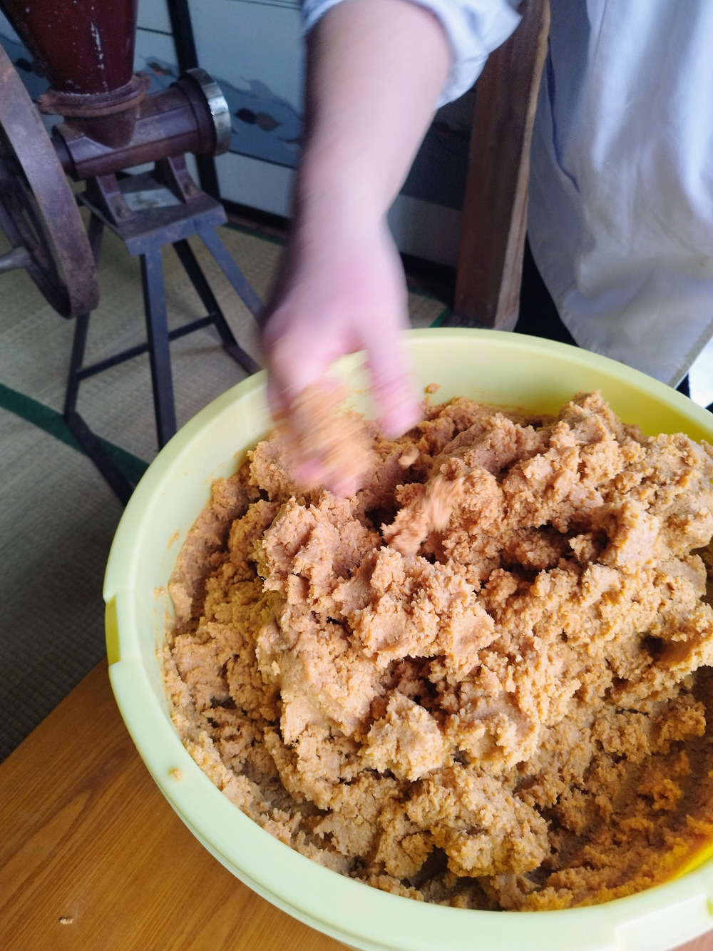 味噌も、セリの水と同じ清流を引き込んで育てた米で自家製糀を仕込み、自然栽培の大豆と良質な天日塩で作ります。豆や糀は、かまどで薪をくべて仕込みます。
