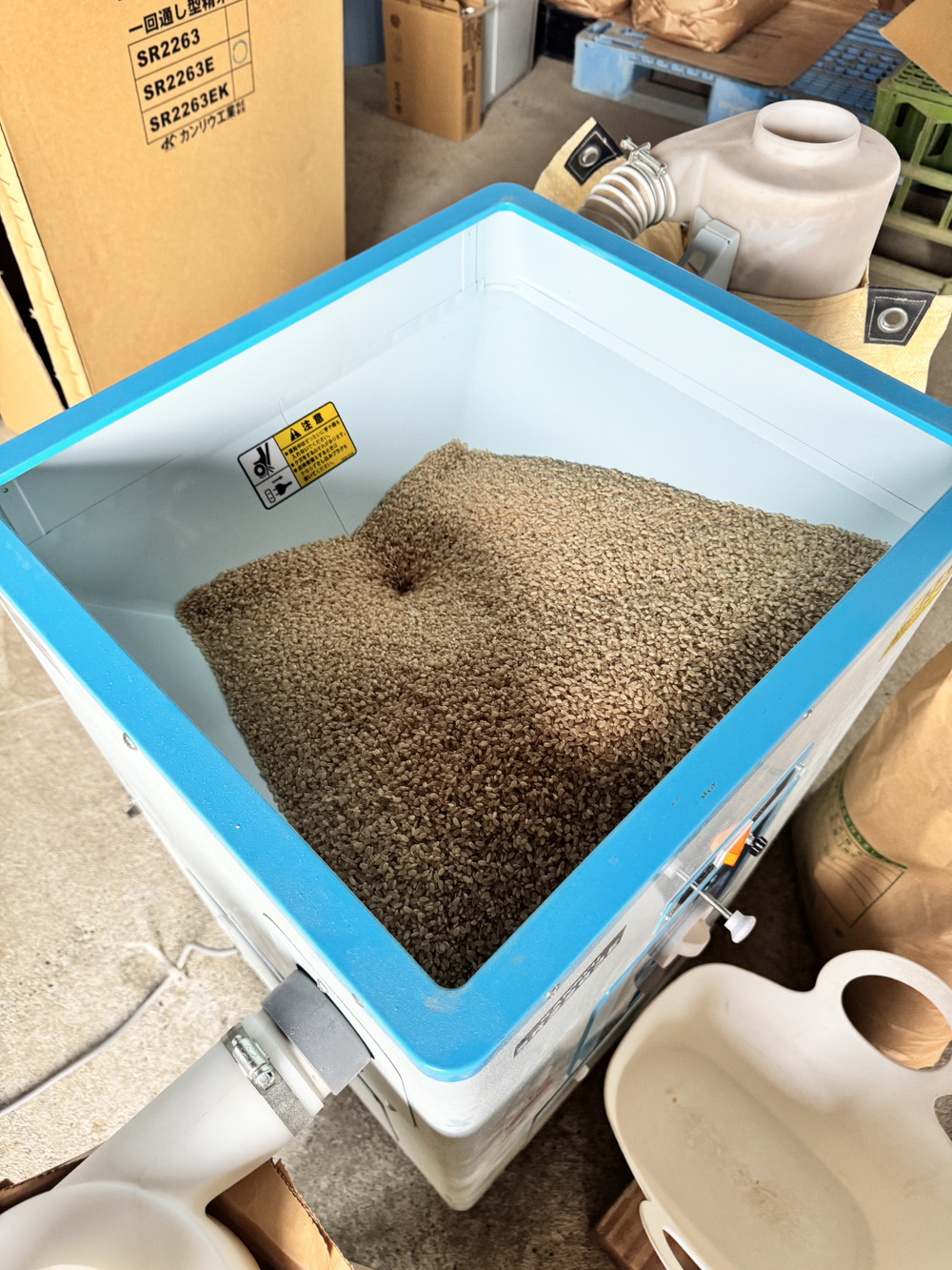 まず、精米機の上から玄米を入れます。