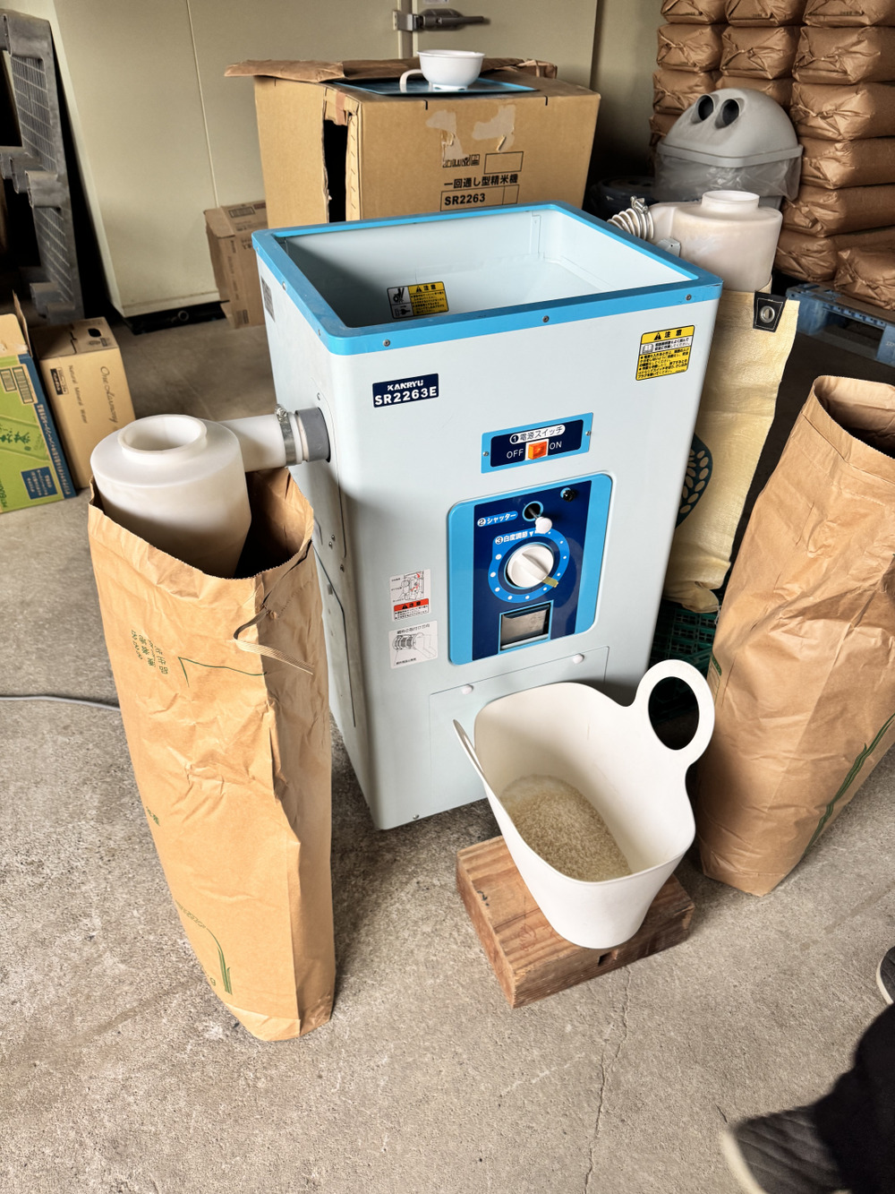 白いお米が出てくるのを確認してから左の袋に詰めていきます!
