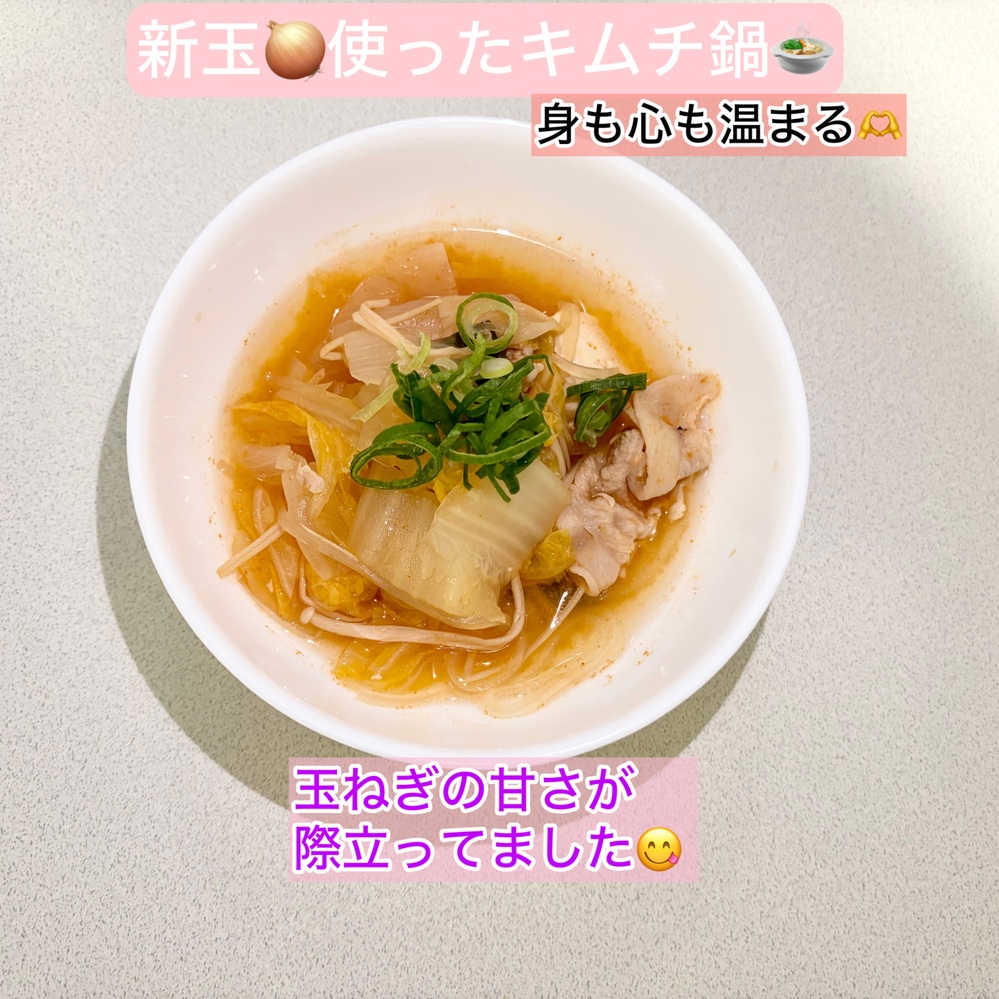 ピリッと辛いキムチ鍋に、旬の新玉ねぎを贅沢に加えた