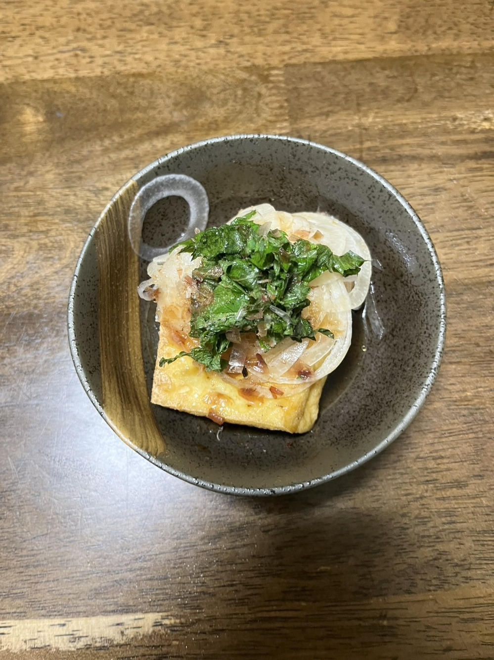 : 厚揚げの上にスライスした新玉ねぎをこんもりとのせ、
