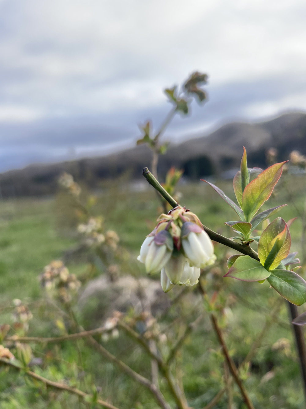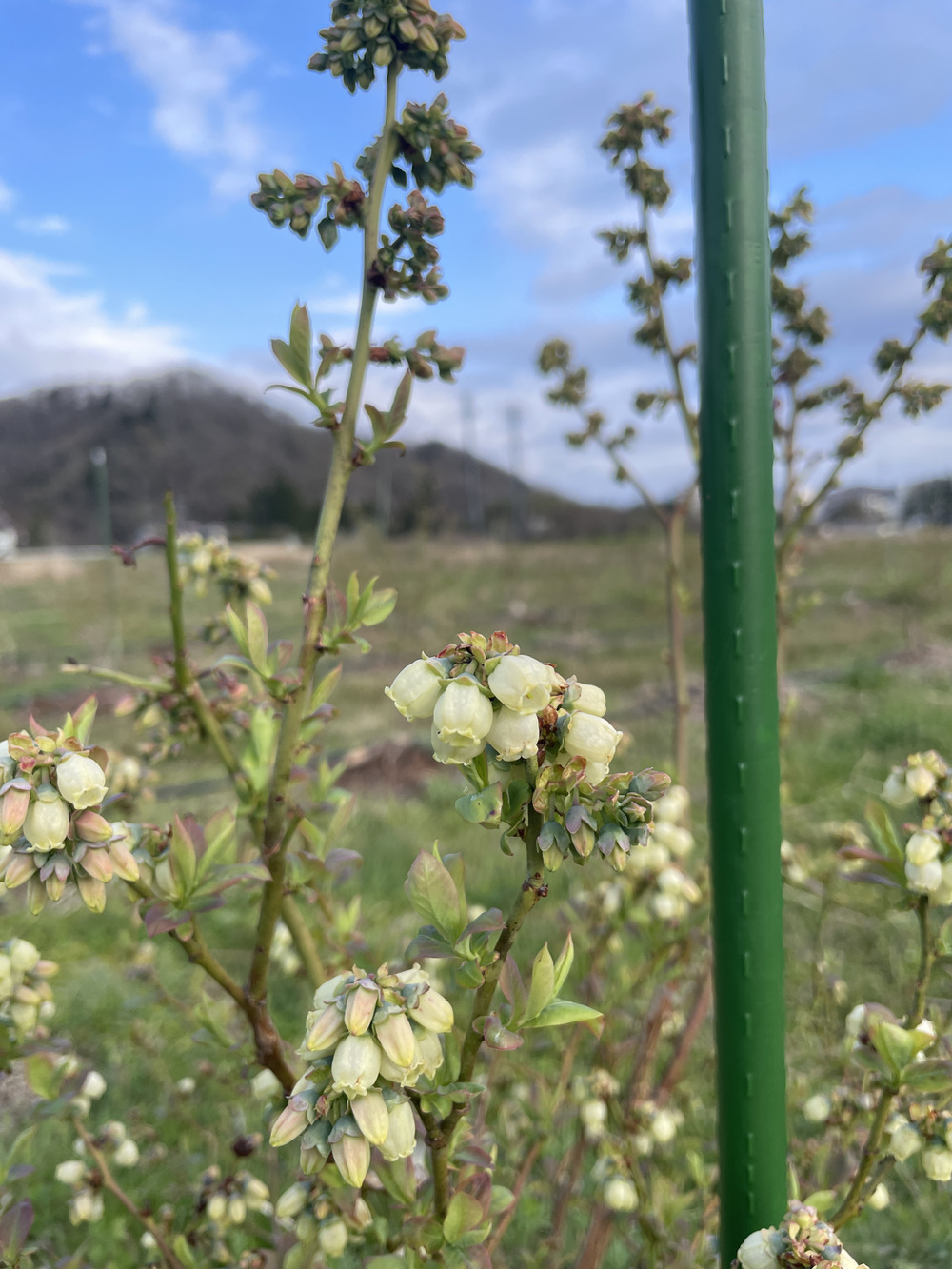 ブルーベリーの花は一つひとつが実へとつながる大切な存在。この時期の天候や受粉の状況が、そのまま収穫量や品質に影響します。ミツバチなどの働きにも助けられながら、少しずつ命がつながれていきます。畑を歩くと、あちこちで同じように咲き始めており、農園全体がやさしい白色に包まれてきました。