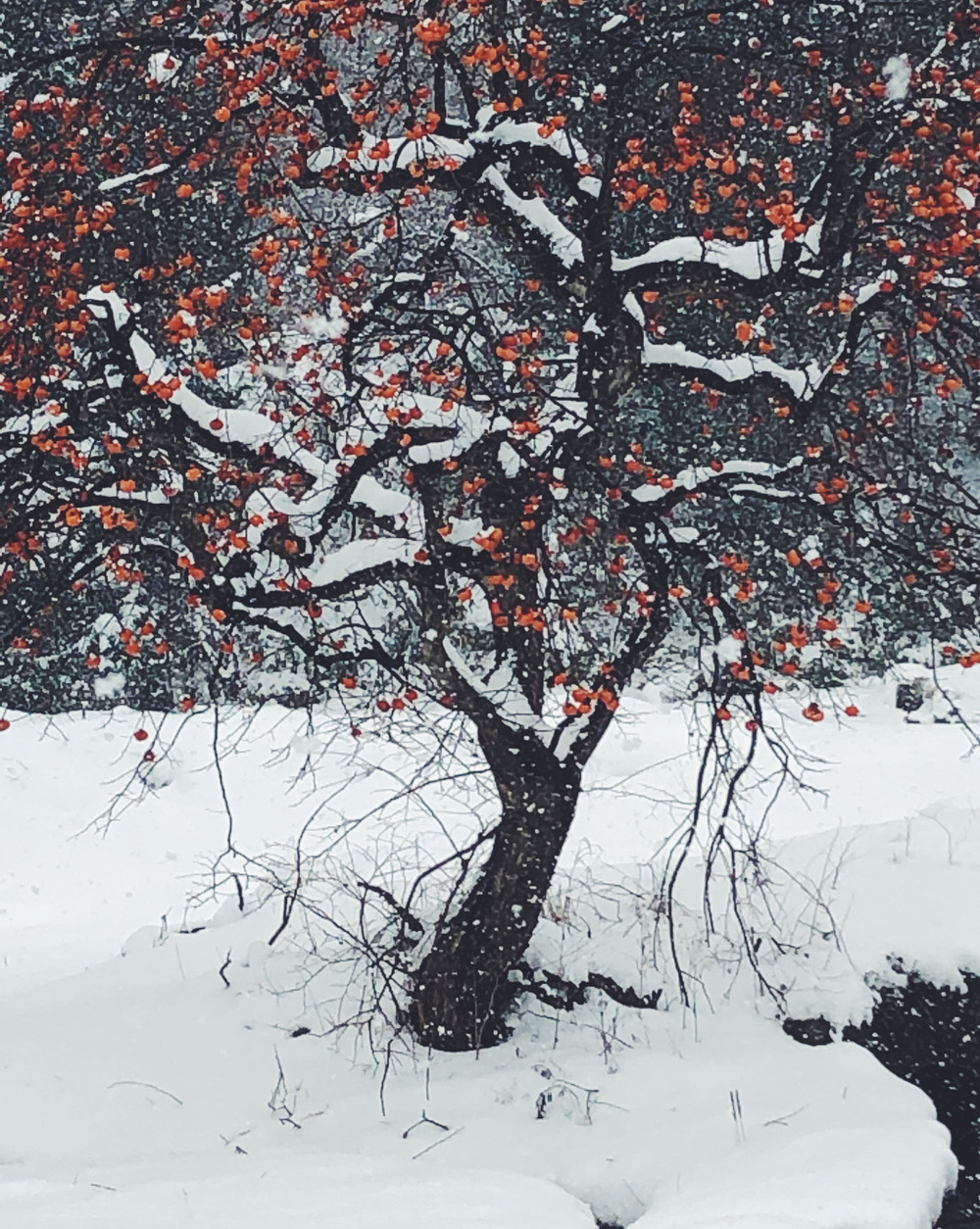 まだ枝にたくさん実っている柿が寒風雪に晒され、侘び寂び感が堪らないです。