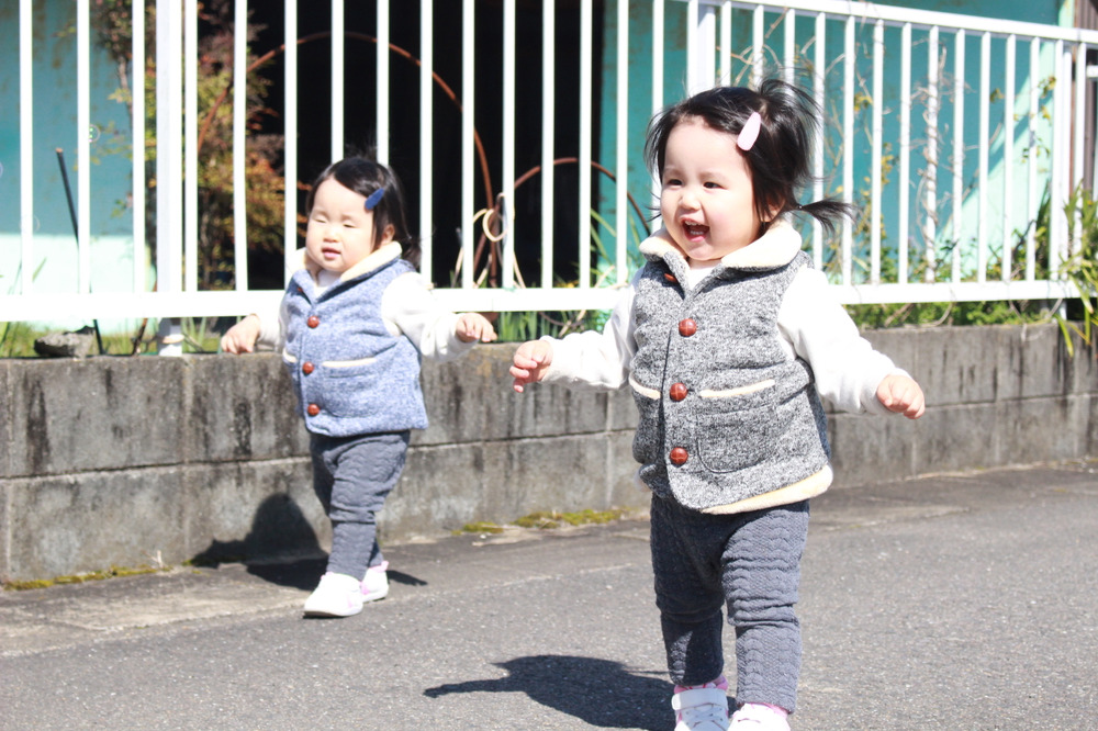 外に連れ出したら2人別々に歩き回る姉妹、石ころを掴み口の中に。