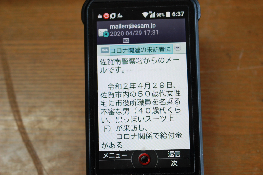 令和2年4月29日、佐賀市内の50歳代女性宅に市役所職員を名乗る不審な男(40歳代くらい、黒っぽいスーツ上下)が来訪し、
