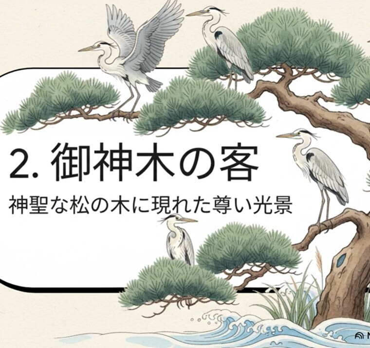 それは、御神木である松の木に住みついたアオサギたちのことです。