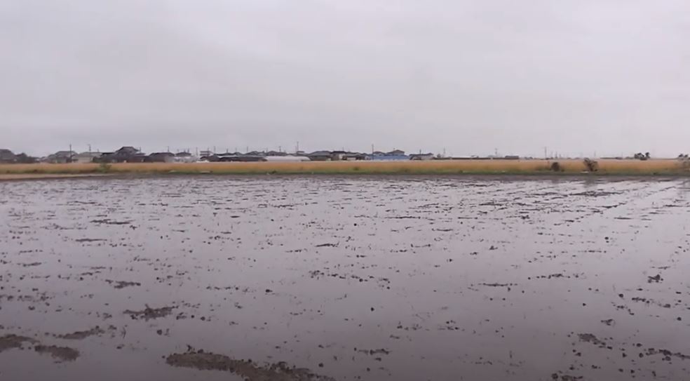 昨夜からの雨で、からからの田んぼが、一面水浸し状態です。
