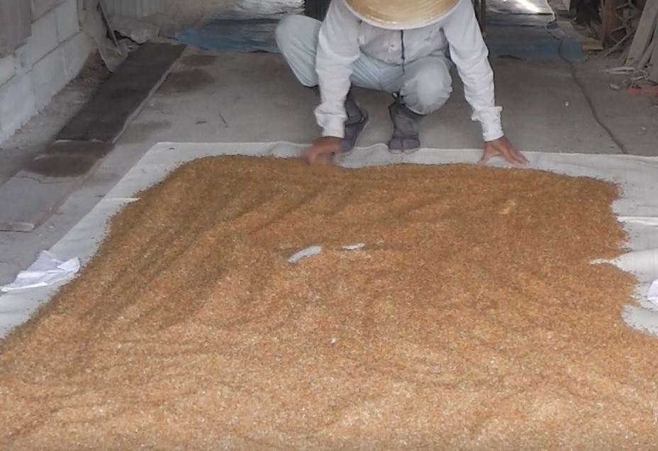 朝種モミを水から上げて、夕方にモミをムシロに広げています。