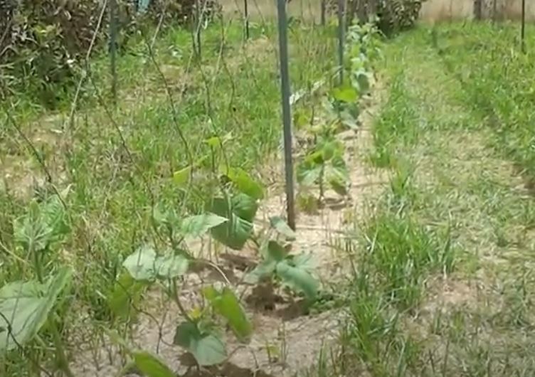 野菜の周りの草は、鎌を使い人の手で除草し、通路を広く取り、その通路は草刈り機で行っています。