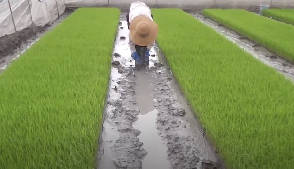 植え付け前に苗床を乾燥する事で、苗箱が苗床よりはがし易くする為です。