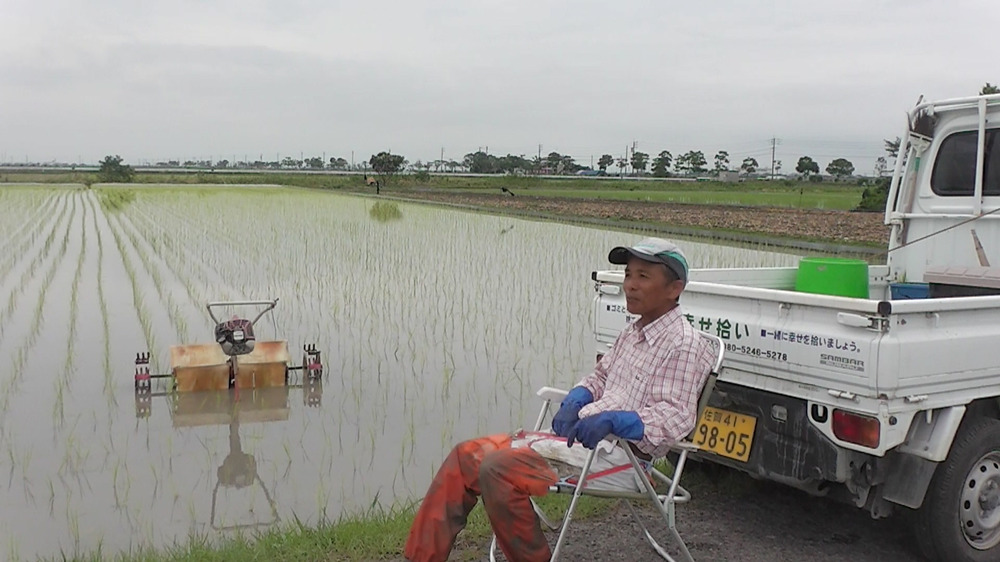 自然農法米(農薬不使用・肥料不使用)は除草機が命、つかの間の休憩