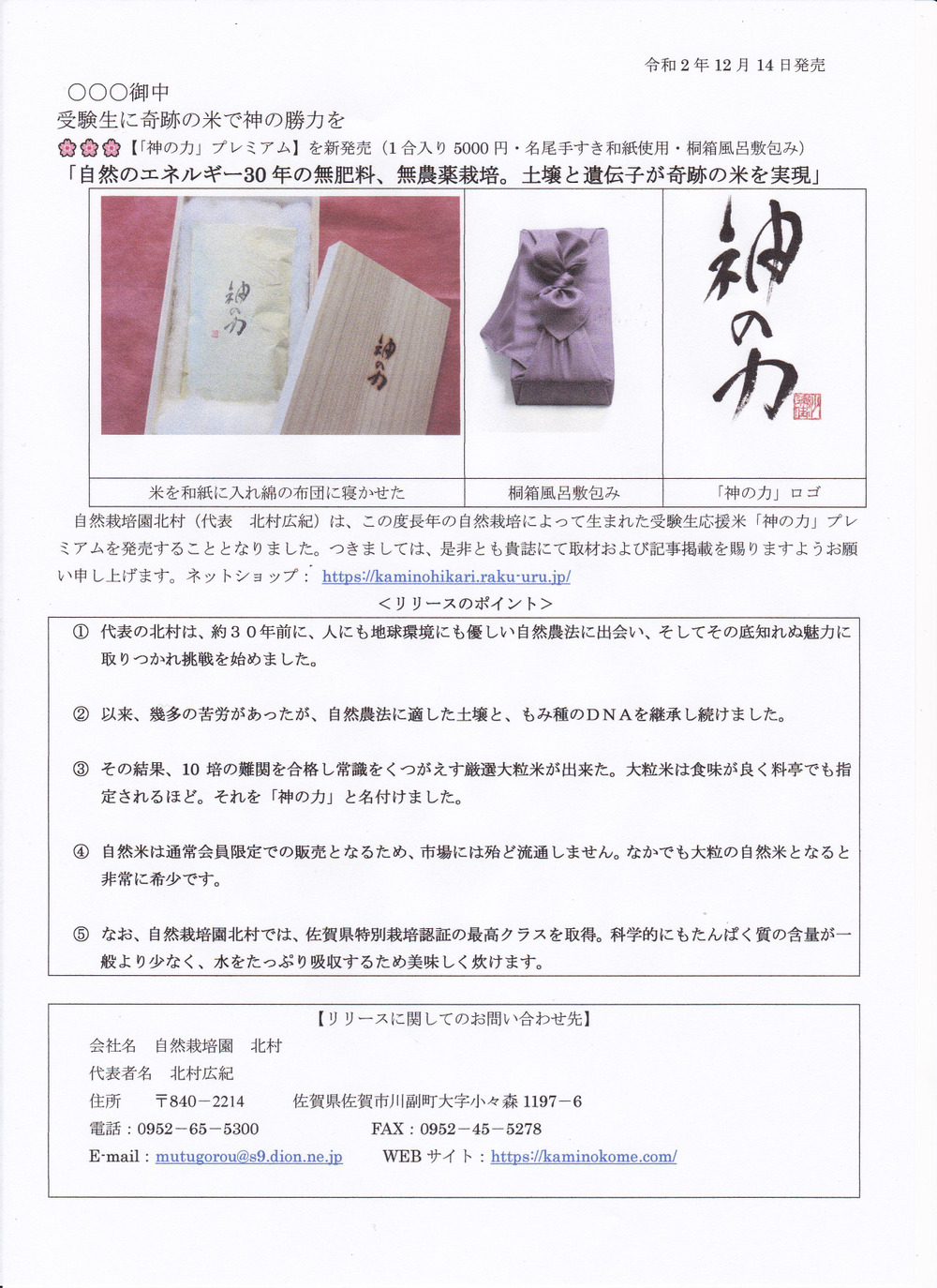 自然栽培園北村(代表 北村広紀)は、この度、38年にわたる長年の自然栽培によって生まれた、自然栽培米の中から特にふるいにふるいをかけたプレミアム米を「神の力プレミアム」として、12月14日に50kg限定で販売することにいたしました。