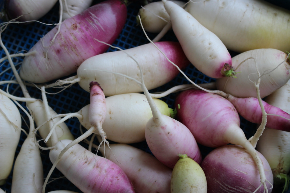 今年の自然農法大根は、小ぶりの物が多く、漬物用に収穫しました。