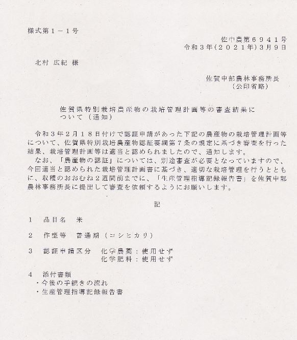 今年も佐賀県特別栽培農産物申請を行い、OKが出ました。