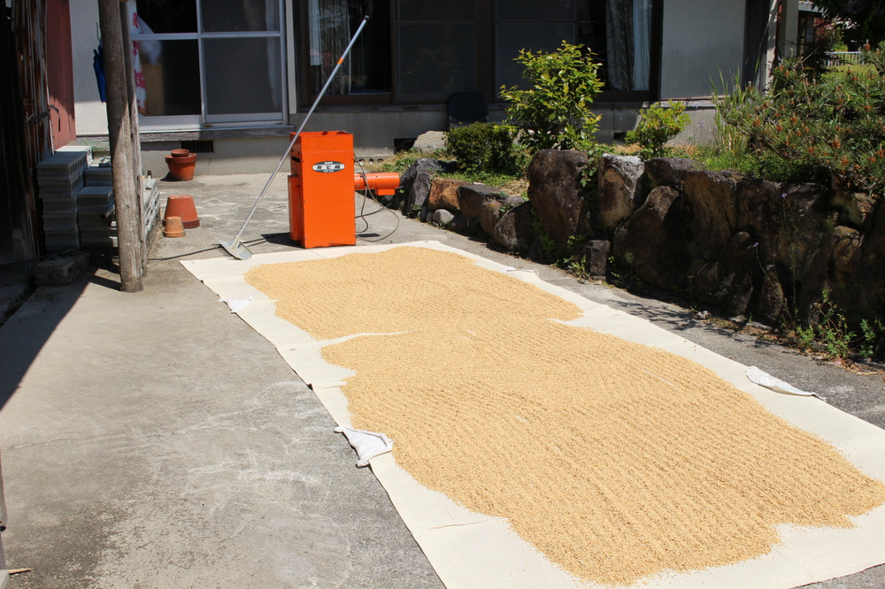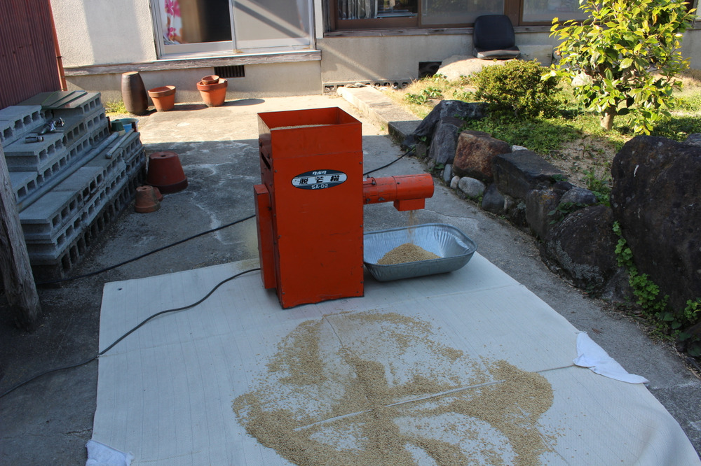 今年も種蒔きの準備が来て、コシヒカリの種を天日で乾かし種に付いたひげを折れやすくしてから脱毛機に掛けます。
