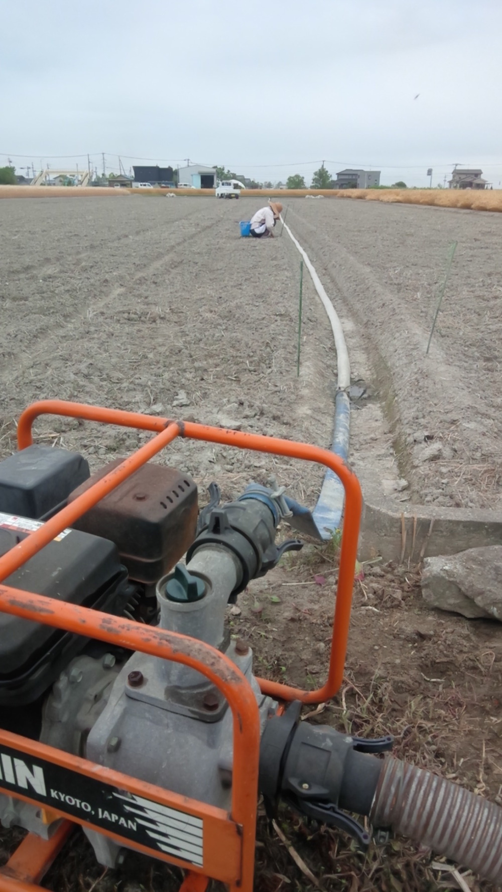 無農薬・無肥料コシヒカリ苗床の準備で川に給水ポンプを設置