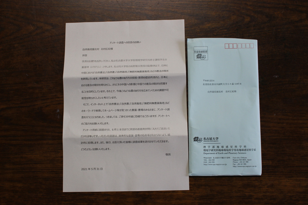 わたしの自然農法について、名古屋大学からアンケートが届きました。