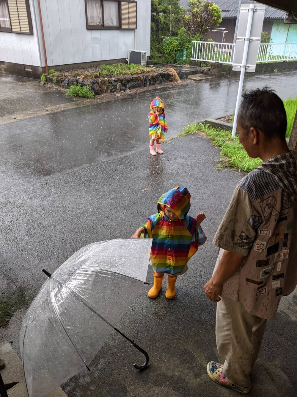家の中で散々遊びましたがエネルギーが残っている様なので、雨の中カッパを着て長靴はいて大はしゃぎ。