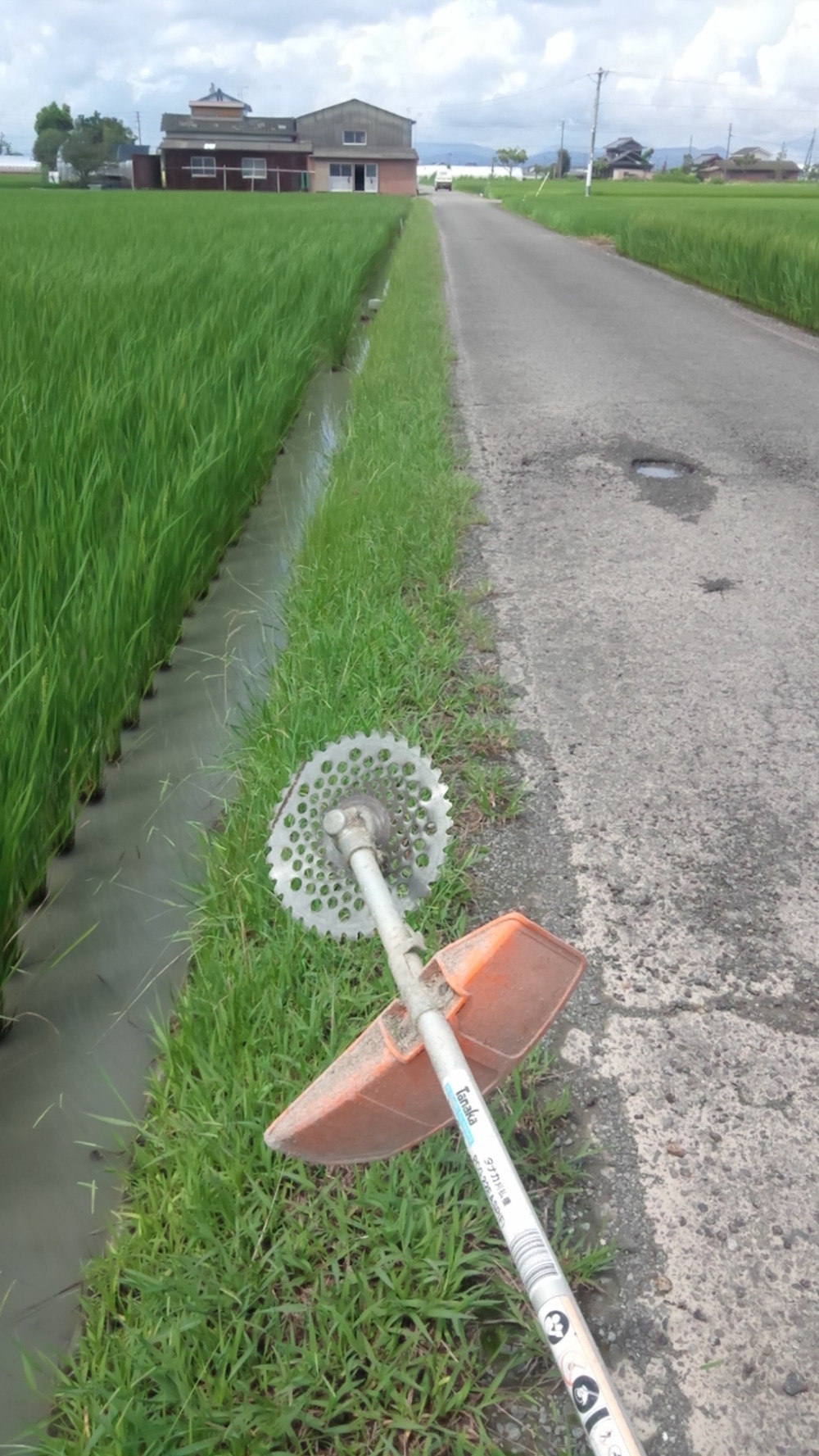 出穂が始まった田んぼの道端を草刈り機で除草。