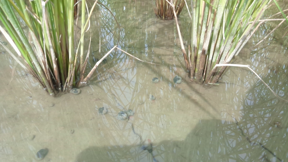水が溜まった途端に、ジャンボタニシが土から出て来て早速行動開始。