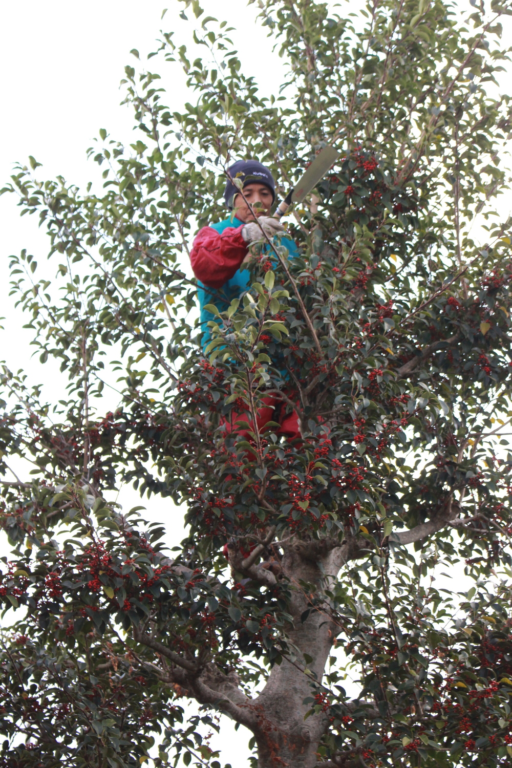 大きな木には、枝を伝わり登って上から剪定して行きます。