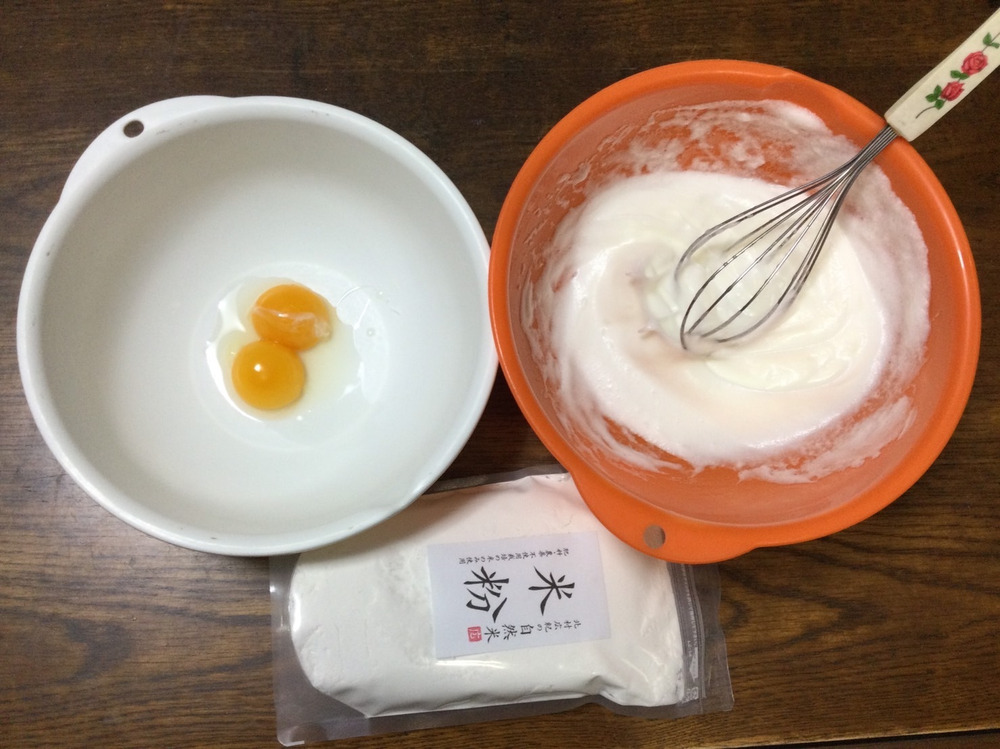 卵白を泡立てて、無肥料・無農薬栽培のパウダー米粉を使用し、砂糖と塩で味付けしました。