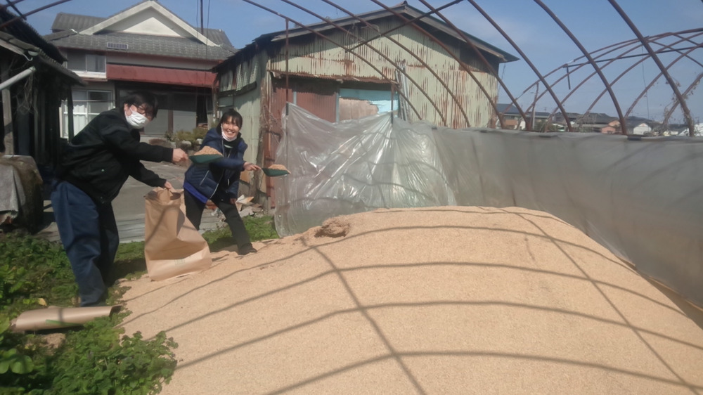 自然農法米(無肥料・無農薬栽培)コシヒカリのもみ殻を頂きに来られております。